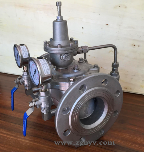300X型緩閉止回閥由主閥、單向閥、針型閥、球閥、微形過濾器和壓力表組成水力控制接管系統。利用水力自動操作,可使主閥得到Z佳的開啟或關閉速度。防止水鍾水擊的產生,以達到緩閉消聲的效果。當緩閉止回閥從進口端給水時,水通過微形過濾器、針型閥、單向閥進入主閥控制室,再經過球閥排水Z下游。因為針型閥開度小于球閥開度,即主閥控制室的排水速度大于進水速度,因此控制室壓力降低,作用于主閥盤下端的進口壓力打開主閥向下游供水。
