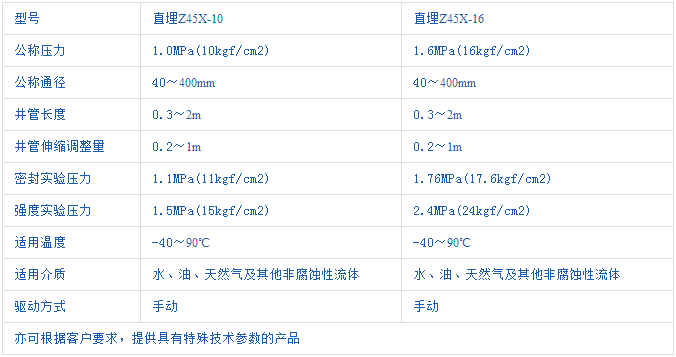 平底式閥座 ——傳統的閘閥往往在通水洗管后即因外物諸如石頭、木塊、水泥、紙屑、雜物等淤積于閥底凹槽內,容易造成無法關閉緊密而形成漏水現象,軟密封閘閥底部采用與水管相同的平底設計,不易造成雜物淤積,使流體通暢無阻。整體包膠—— 閥門采用的橡膠進行整體內、外包膠,國內 的橡膠硫化技術使得硫化后的閥門能夠保證 的幾何尺寸,且橡膠與球墨鑄鐵閥門接著牢靠,不易脫落及彈性記憶佳。耐腐蝕—— 閥體采用粉體環氧樹脂涂裝,可防止閥體的腐蝕及生銹,并可用于污水系統。不易碎裂 以往傳統鑄鐵閘閥常因外物擊中、碰撞或重疊而造成斷裂等現象。由于本體改用球墨鑄鐵,此種情形已可大副度減少。三“O”型環密封圈—— 由于閥桿采用三“O”型環密封圈密封設計 ,可減少開關時的摩擦阻力,大幅減少漏水現象及可以不停水施工更換密封圈。有助生飲—— 由于閥體內部以無毒性環氧樹脂涂裝,閘板的內外表面均以橡膠完全包覆而不Z于出現銹水或腐蝕現象,可供生飲。精鑄閥體 ——閥體采用精密鑄造, 的幾何尺寸使得閥體內部無需任何精加工即可保證閥門的密封性。重量輕 ——本體采用球墨鑄造制成,重量較傳統閘閥重量減輕約20%~30%,安裝維修方便。 MZ45X-10、MZ45X-16Q直埋式彈性座封閘閥技術參數: